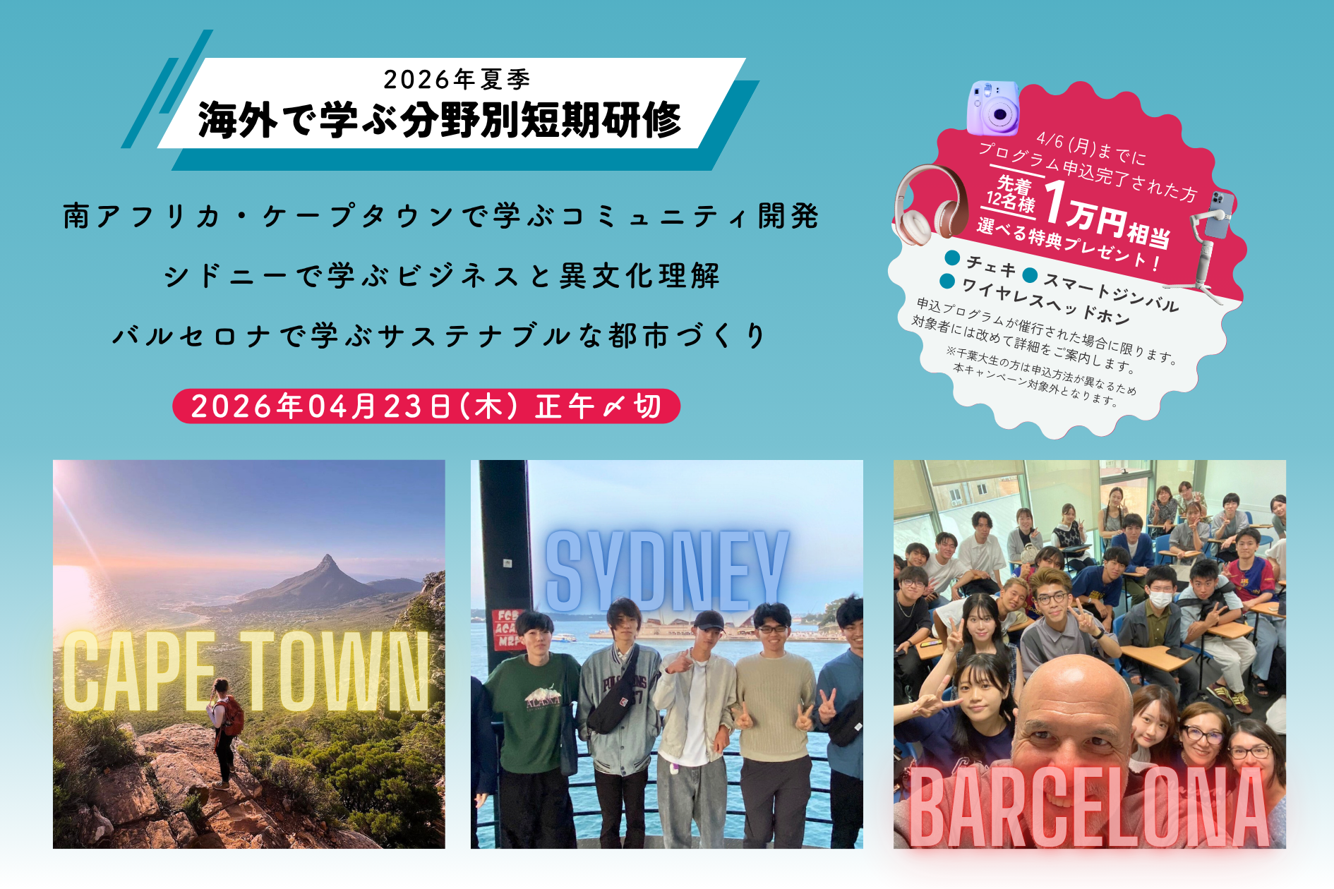 2026年4月6日(月)23:59までに申込を完了された先着12名の方に1万円相当の選べる特典プレゼント!*(ワイヤレスヘッドホン/スマートジンバル/チェキ)